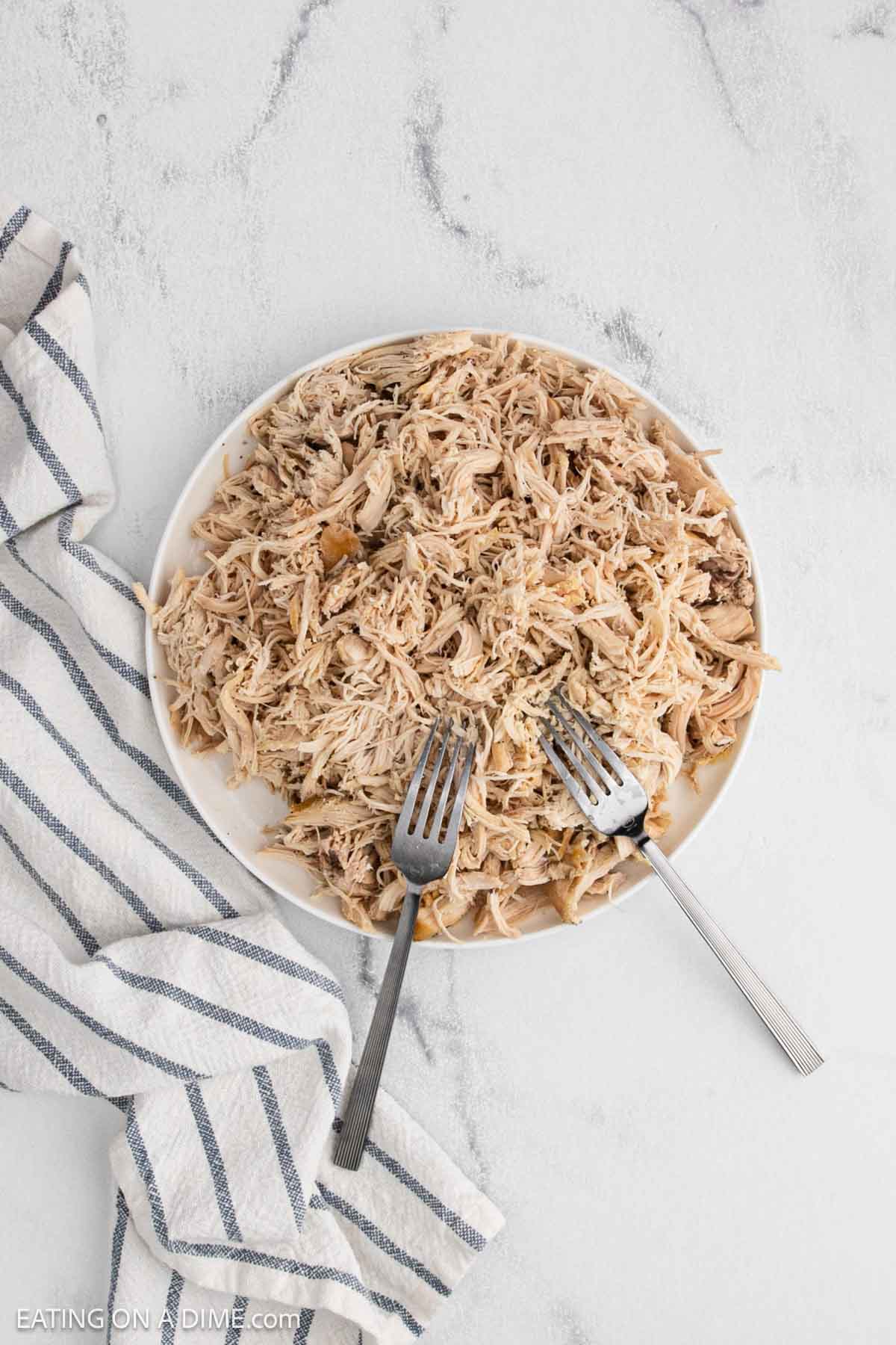 You can use 2 forks to easily shred the chicken. The meat is super tender and this is really easy. I also like to use my stand mixer. This is a little trick I learned to quickly and easily shred large quantities of chicken.