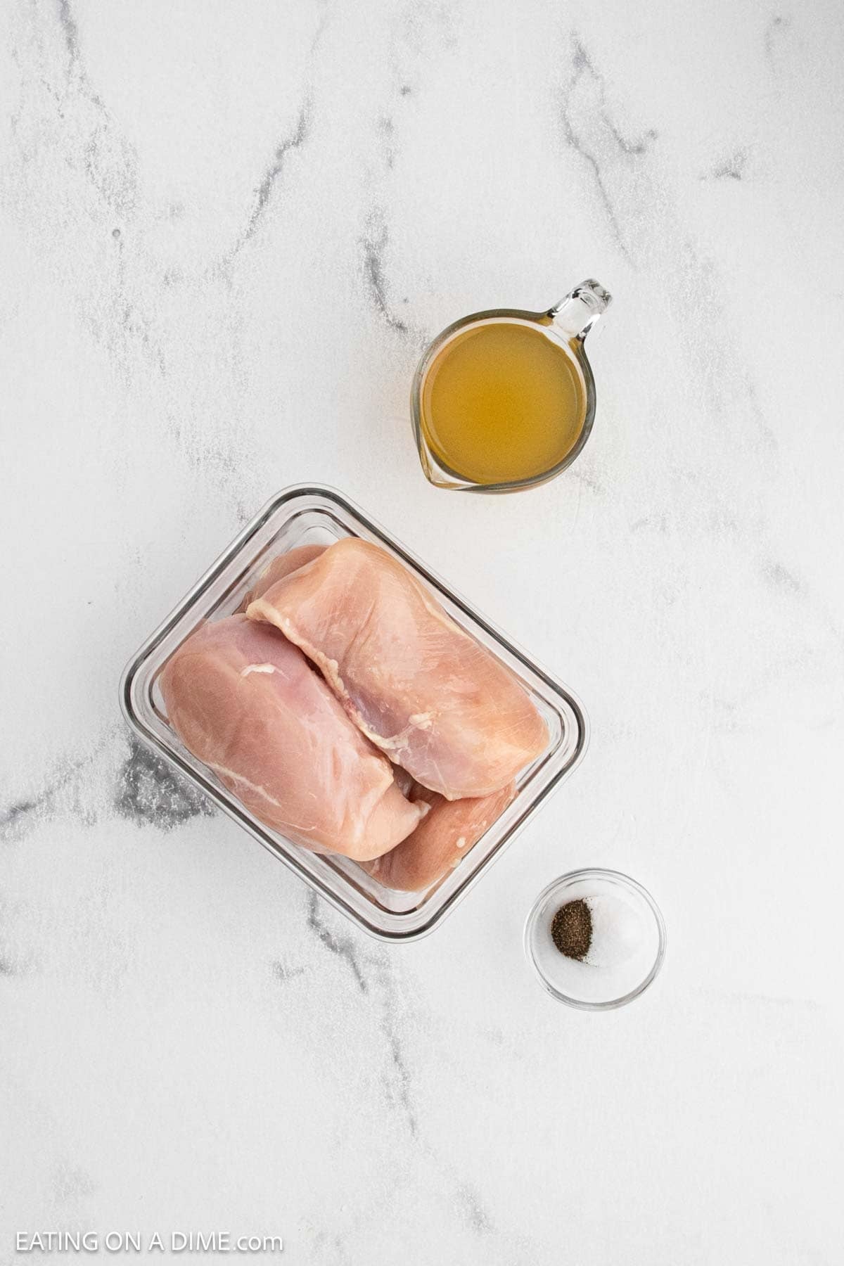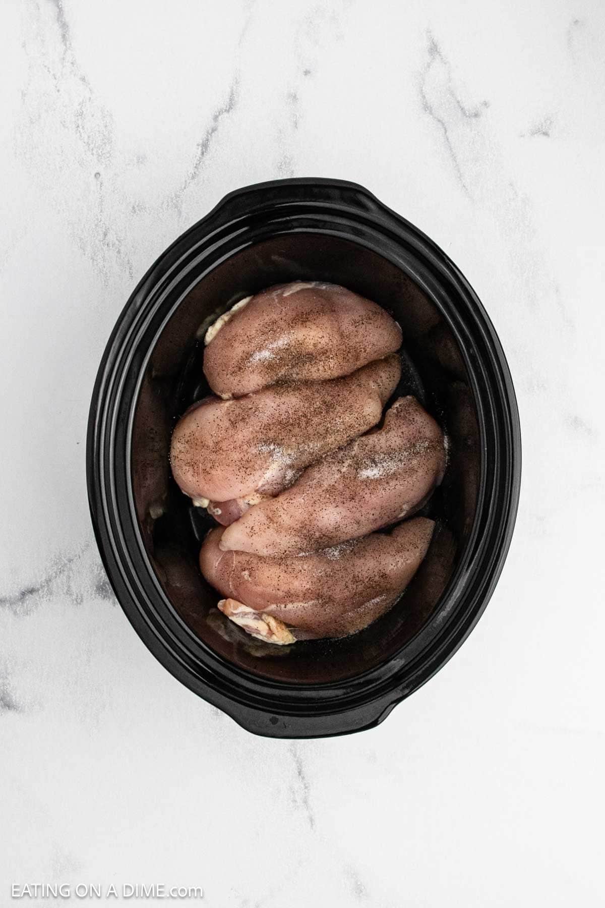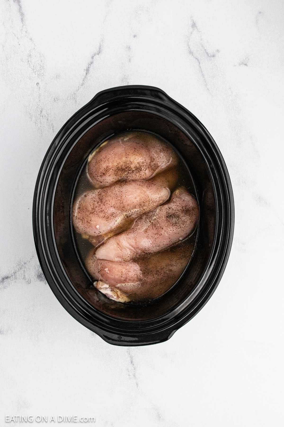 Step 2 – Sprinkle salt and pepper on the chicken. Next, pour the chicken broth all over the top.