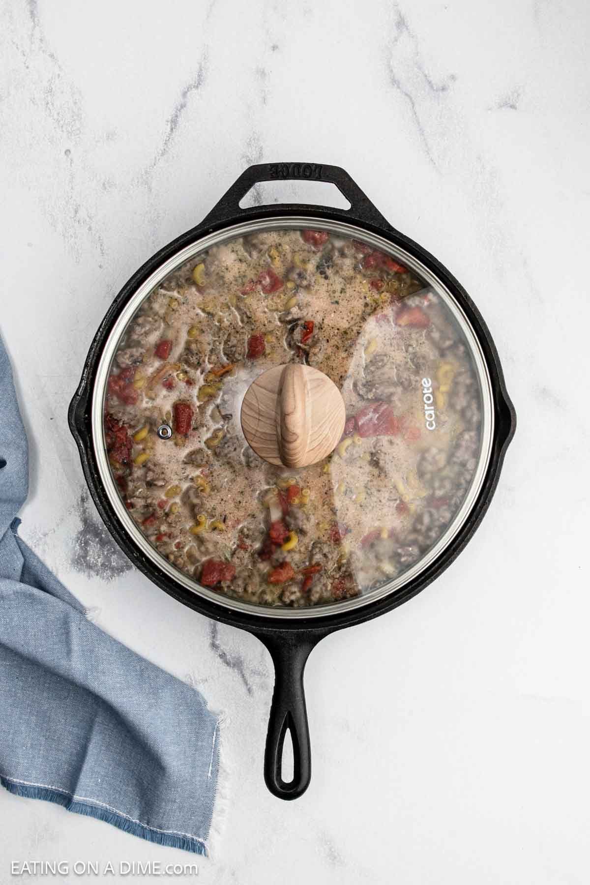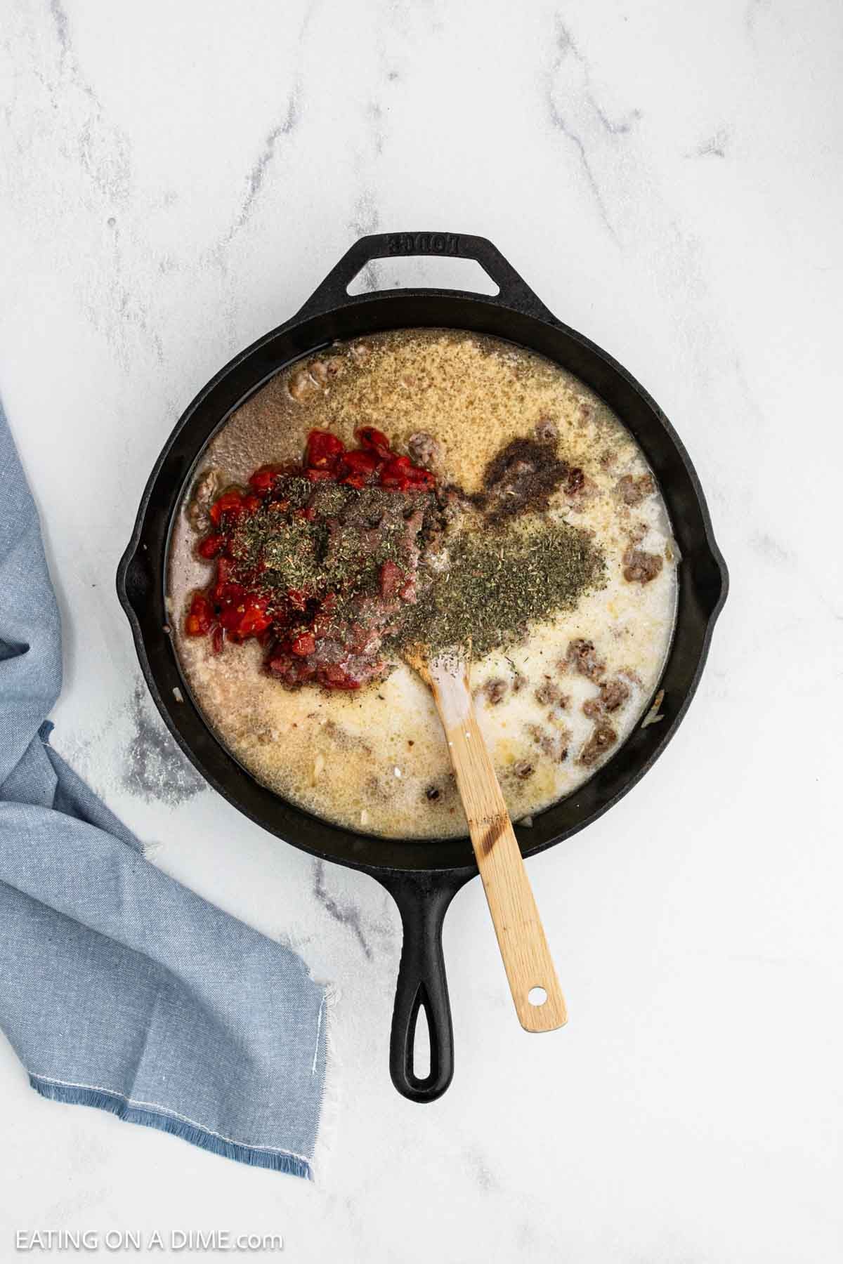 - Stir in the additional Ingredients – Then stir in the diced tomatoes, Italian seasoning, salt, pepper, water and half and half. Then stir in the elbow macaroni. Bring the mixture to a boil, cover and reduce the heat to a low simmer.