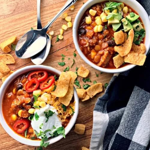 Make this turkey lentil chili to take your chili dish to the next level. It includes ground turkey, beans, and lentils with spicy and strong flavors. Add your favorite toppings like avocado, cornbread, and shredded cheddar cheese.