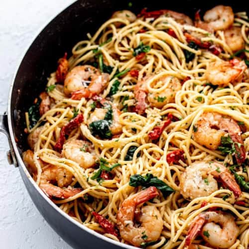 This flavorful Lemon Garlic Parmesan Shrimp Pasta combines leftover shrimp, olive oil, sun-dried tomatoes. Add in baby spinach for a fresh and tasty one-pot meal.