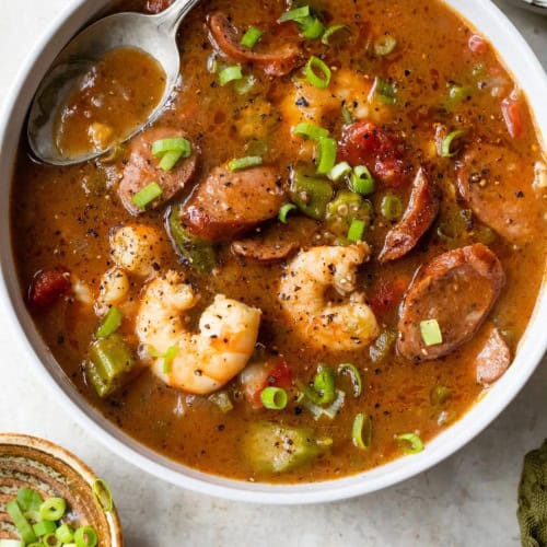 This aromatic Shrimp and Sausage Gumbo features a rich roux-based sauce. Complemented by the meaty goodness of leftover shrimp and sausage.