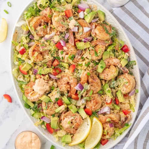 Packed with your favorite salad veggies, succulent seasoned leftover shrimp. Then topped with a creamy, spicy dressing, every bite is bright and flavorful.