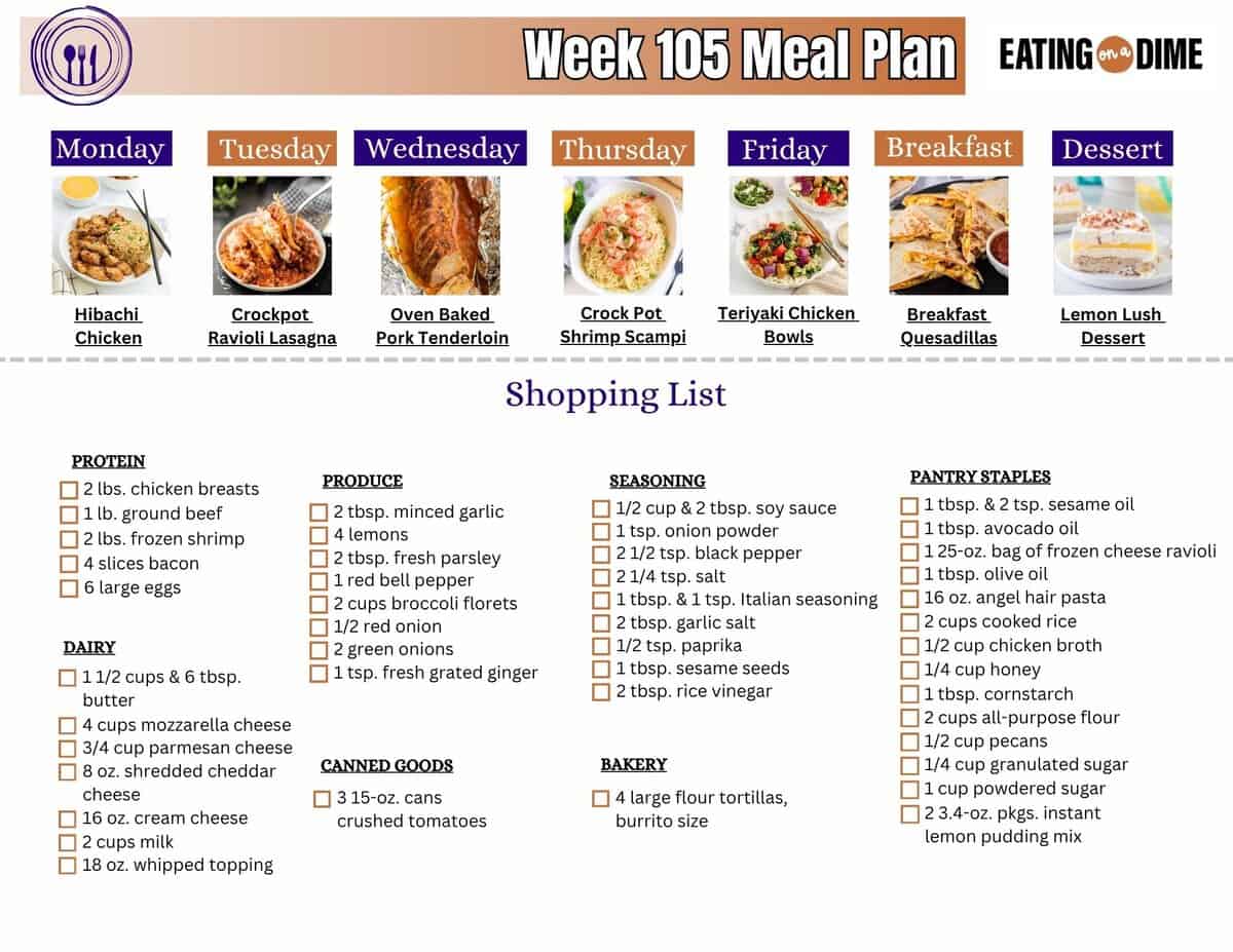A collage of six food photos—Hibachi Chicken, Crock Pot Ravioli Lasagna, Oven Baked Pork Tenderloin, Crock Pot Shrimp Scampi, Teriyaki Chicken Bowls, and Lemon Lush Dessert. Text reads: “Meal Plan 105 Weekly Meal Plan + Shopping List!”.