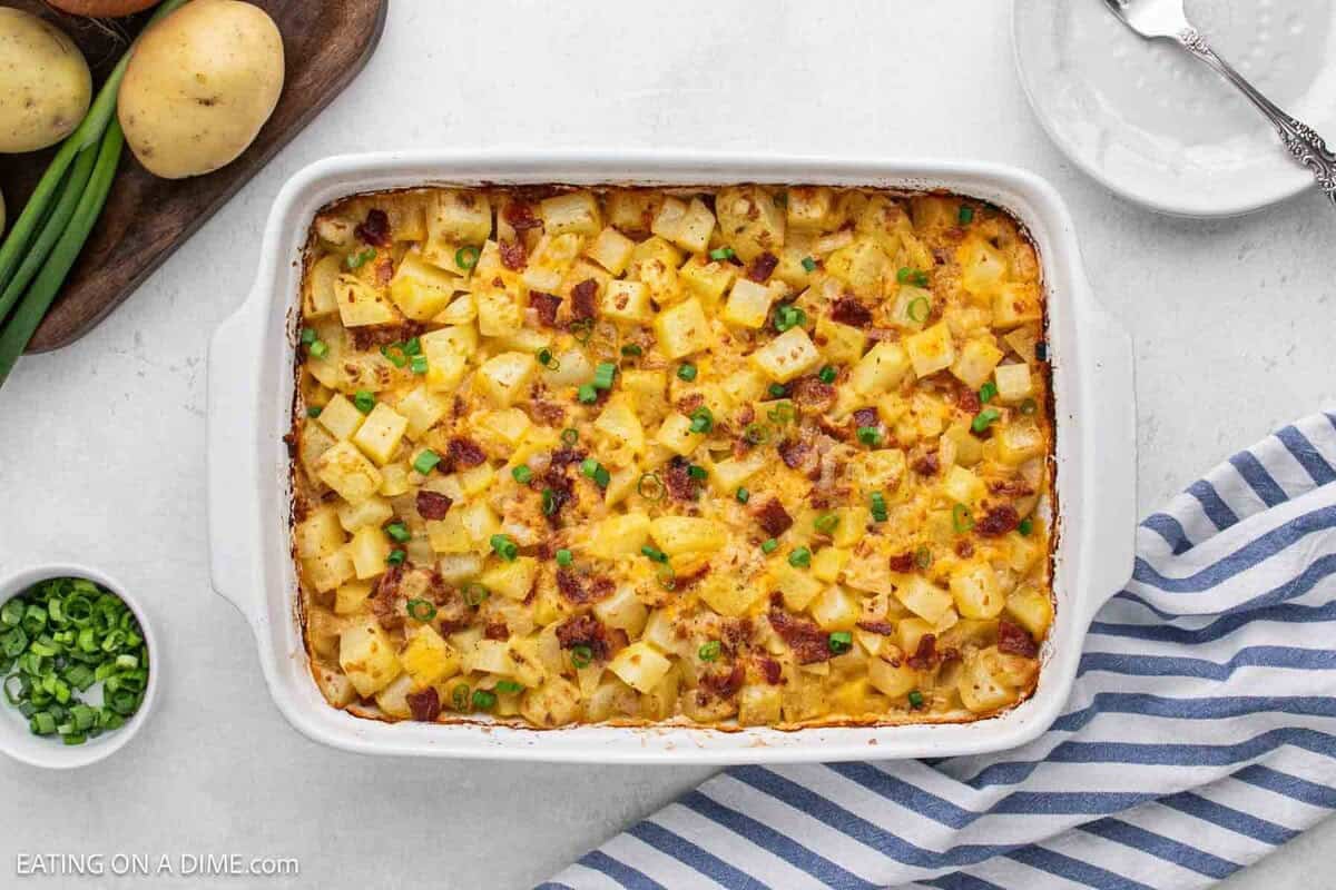 Mississippi Mud Potatoes are a baked potato casserole made with diced potatoes, bacon, cheddar cheese, and a creamy mayo-based mixture.