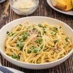 Cheesecake Factory Pasta Carbonara has a creamy Parmesan sauce flavored with bacon, tender peas and more. This copycat pasta dish is easy to make and delicious.